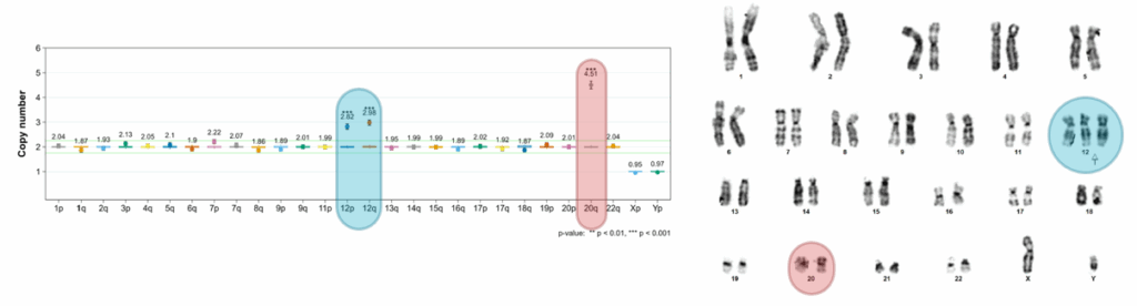 On the left: digital PCR-based iCS-digitalTM PSC results revealing a significant abnormality on chromosome 20q. On the right: the same sample analyzed by G-banding, which fails to detect the 20q abnormality due to limited resolution (source: Stem Genomics platform).